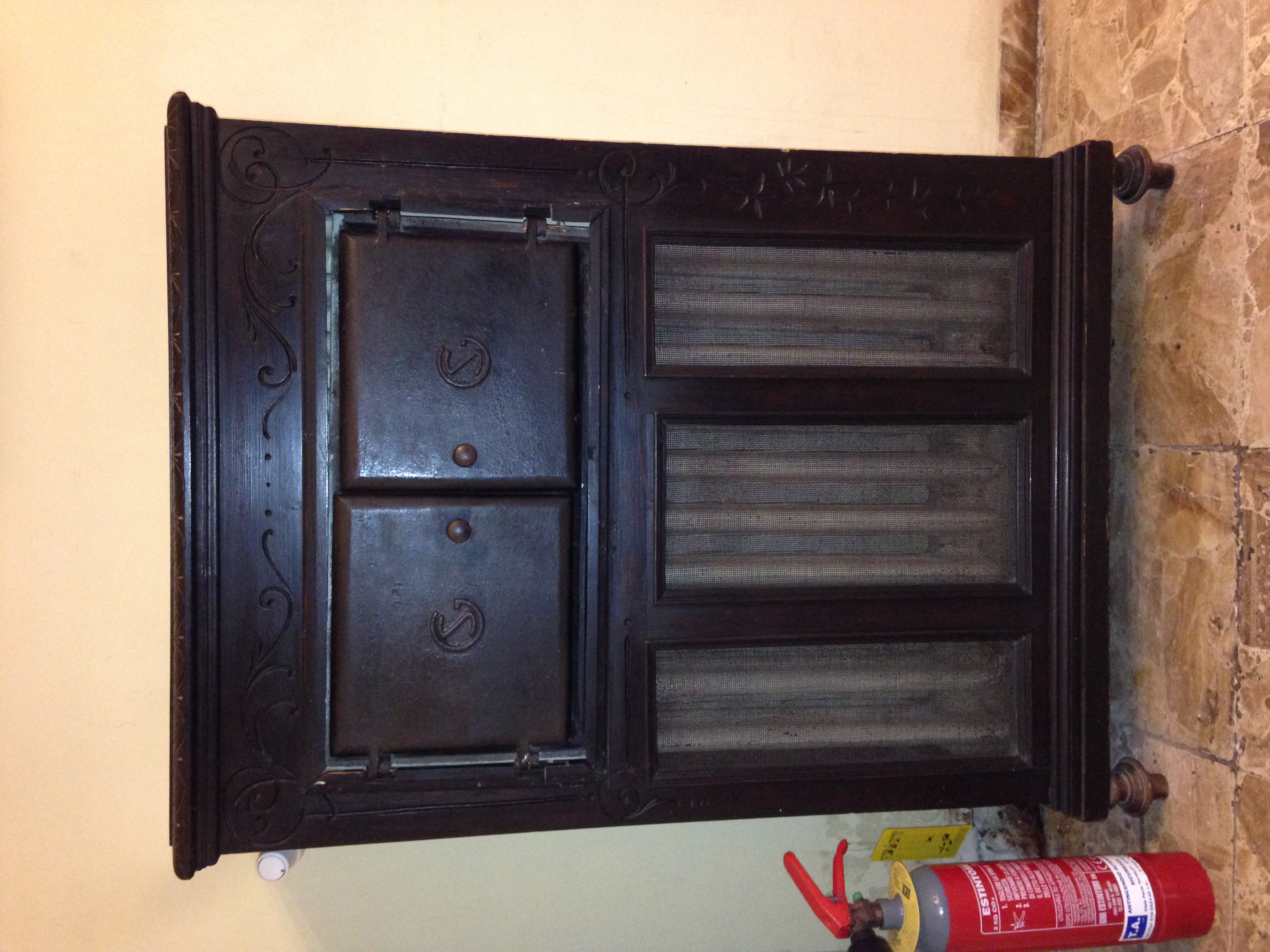 Copricalorifero in legno e metallo, decorato sul telaio ligneo con motivi incisi a coup de fouette in stile Art Nouveau, dotato nella parte alta di un vano scaldavivande in ghisa a due sportelli, recanti le cifre G S (Gaspare Sant'Elia)