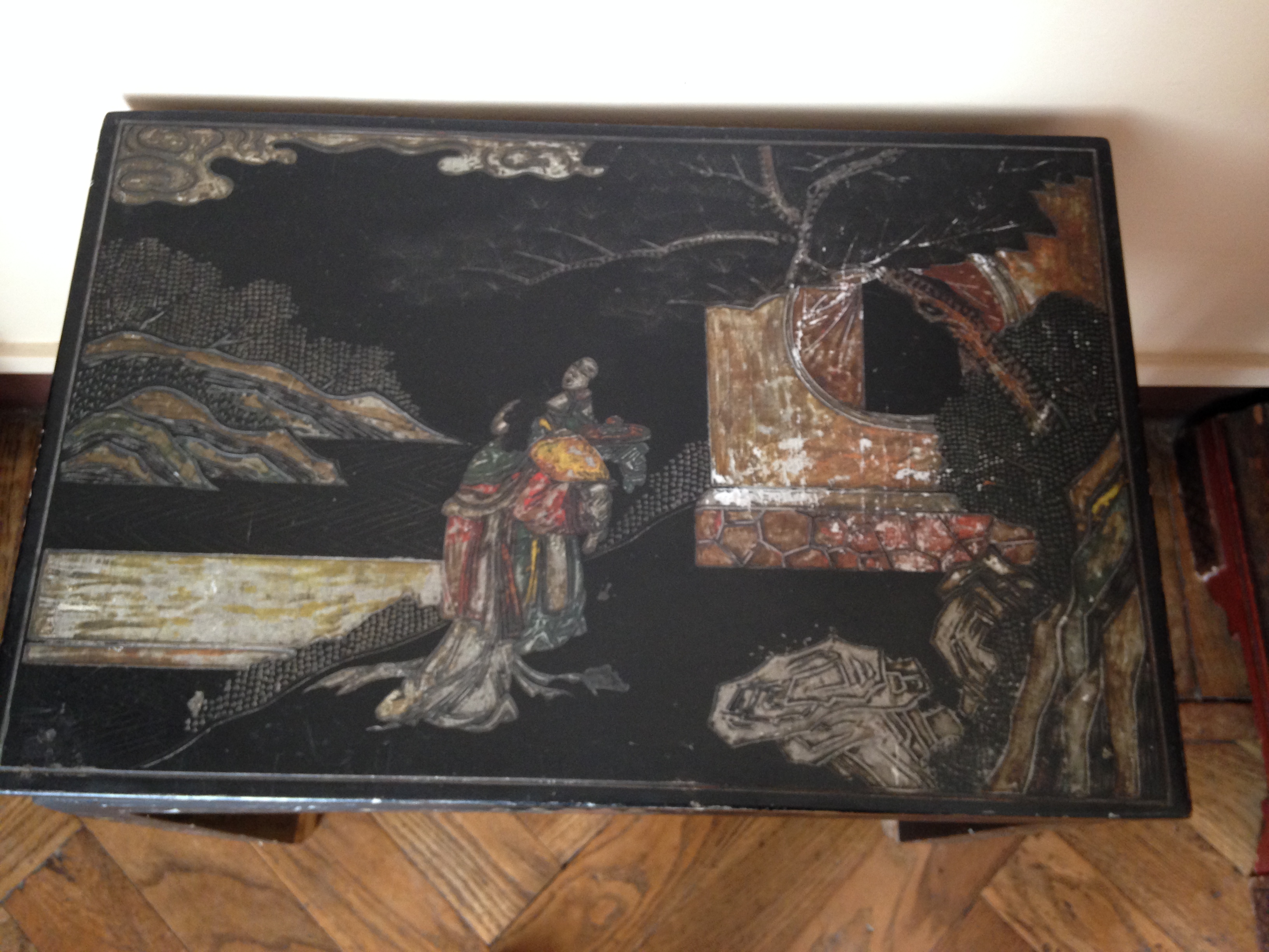 Tavolino da té a quattro gambe dritte, con piano rettangolare, laccato in colore nero, con motivi di genere, vegetali e floreali dipinti e intarsiati in madreperla sulla superficie del piano e nel telaio. Potrebbe trattarsi di una produzione occidentale in stile orientale