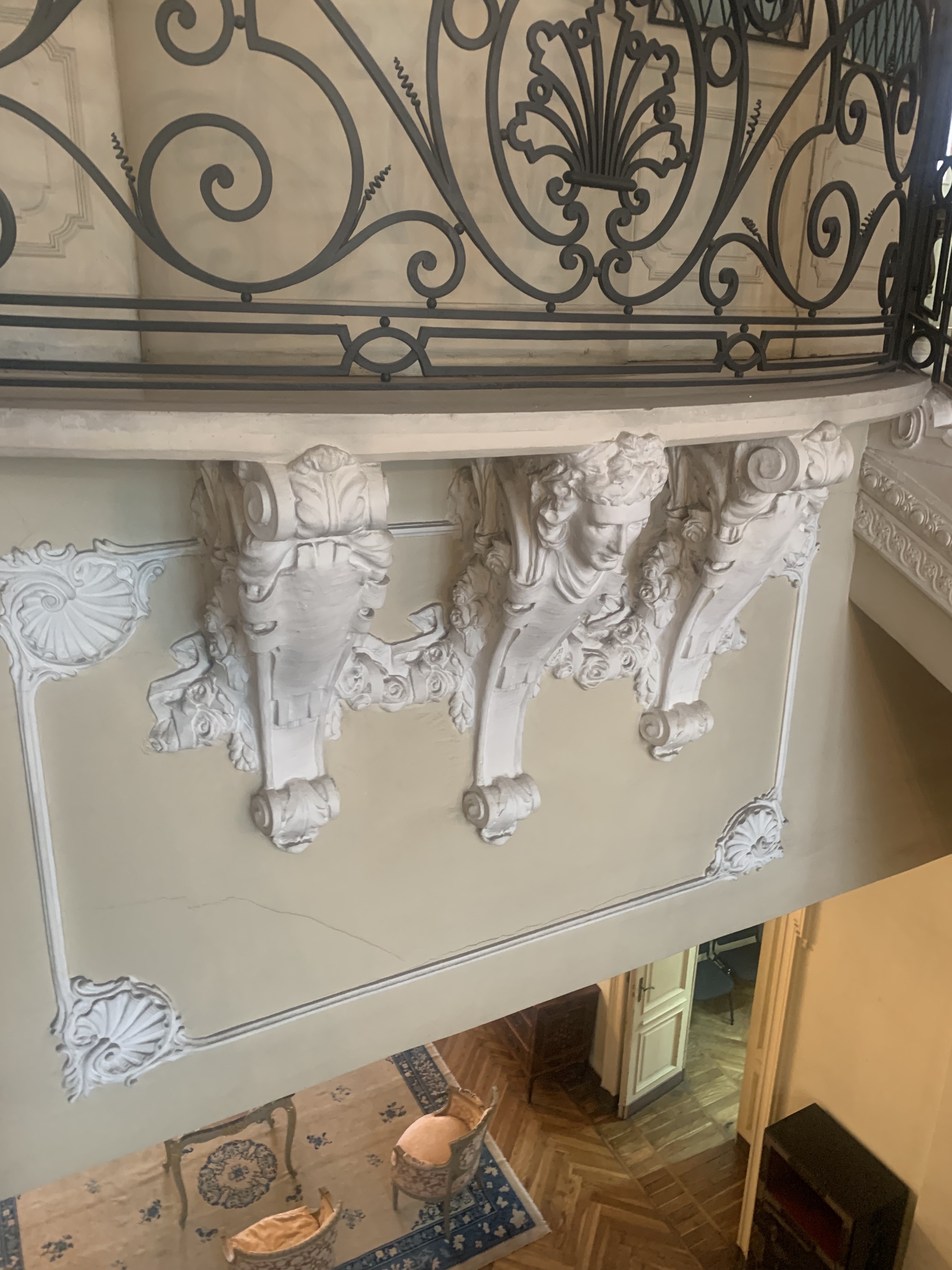 Mensole architettoniche in stucco bianco, che reggono il balconcino curvilineo nel quale si incontrano i bracci dello scalone a tenaglia. La mensola centrale presenta una protome muliebre e quelle laterali una decorazione a foglia. Sono unite da festoni e nastri che corrono sulla parete. Le volute con cui terminano le mensole si avvolgono a una foglia d'acanto. Risultano incorniciate da un motivo rettangolare a stucco, con gli angoli a conchiglia