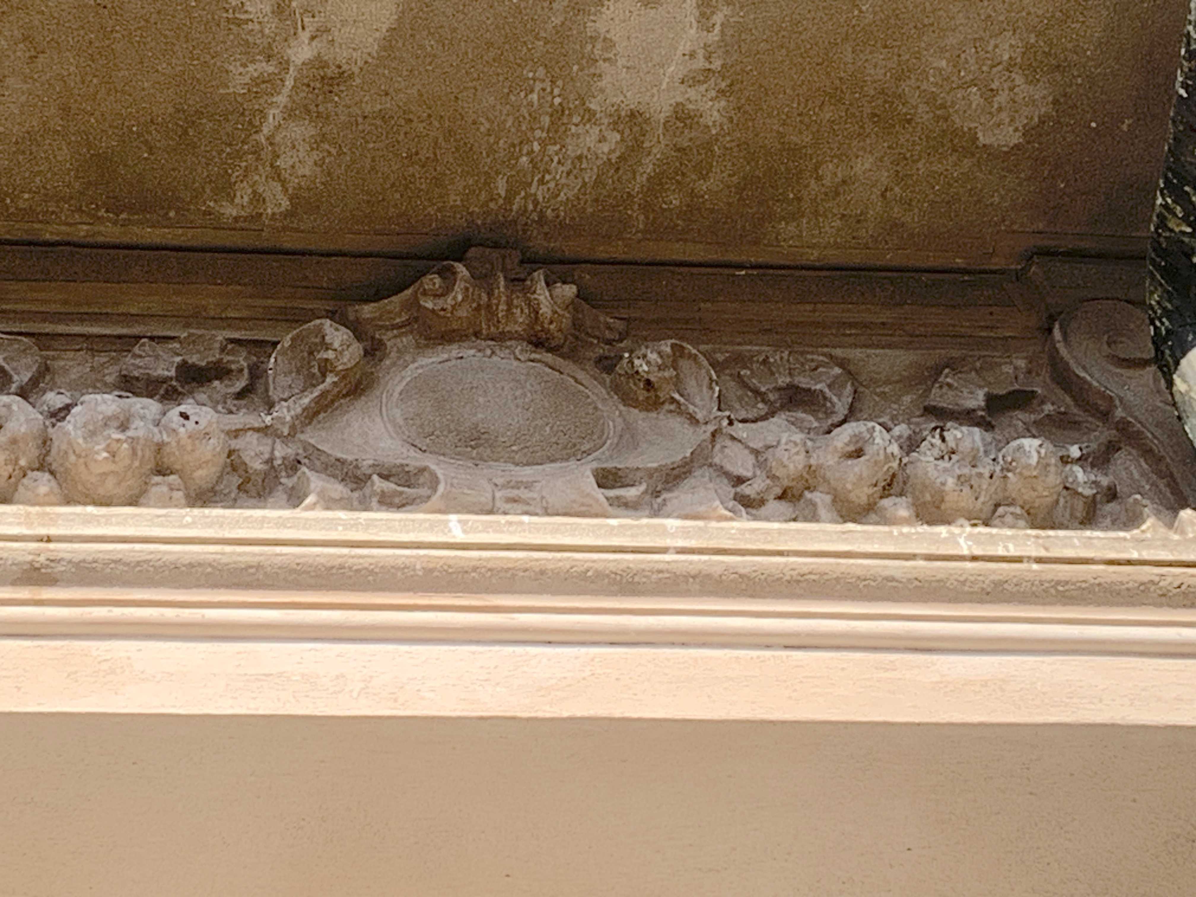 Fregio di fabbricazione seriale, con decorazioni neo rinascimentali a festoni e nastri, intervallato da scudi e capitelli pensili a volute