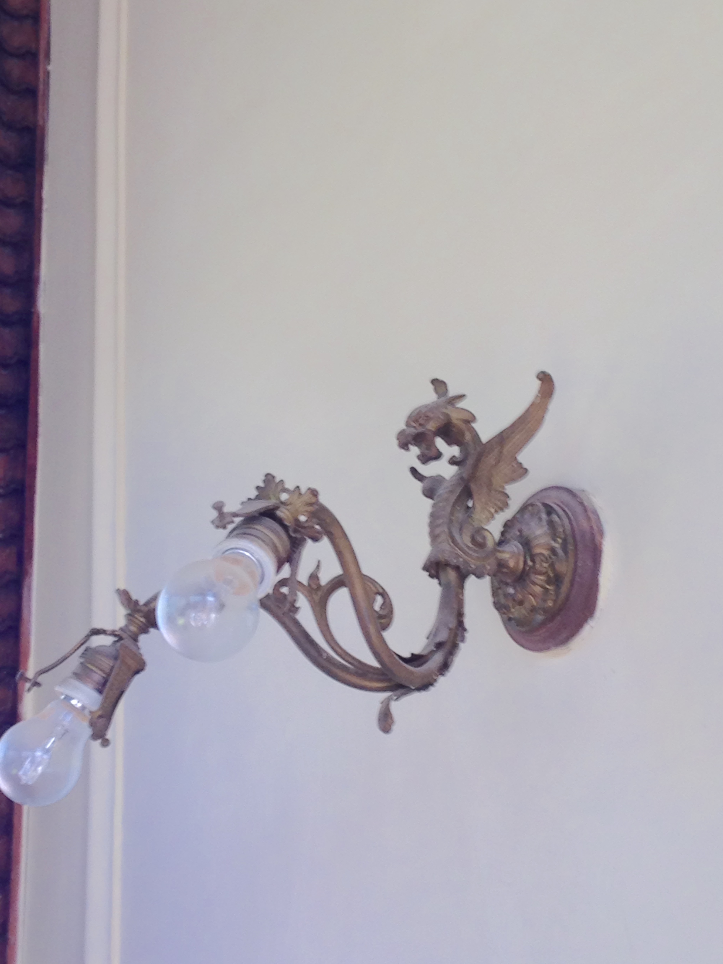 Lampada in ottone a parete, con una rosetta a stampo, cui è saldato un drago con le fauci spalancate da cui si dipartono due bracci ai cui terminali è posto l'attacco per le lampadine, decorato con motivi fitomorfi, spartito da una voluta dalle linee Art Nouveau
