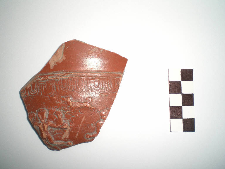 - NOTIZIE STORICO CRITICHE Materiale reperito durante la ricostruzione della casa del rag. Giovanni Bonazzi. Deposito archeologico non primario ma materiali provenienti da sito primario ed usati per costruire il piano di fondazione della costruzione. Motivo del cane simile su frammento ritrovato a S. Lorenzo di Pegognaga (Archeologia di un ambiente padano. S. Lorenzo di Pegognaga, Mantova, a cura di Anna Maria Tamassia, 1996 pg.186 fr. 87)