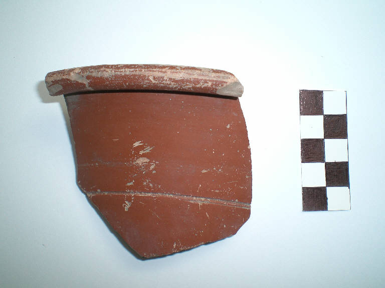 Frammento di orlo di coppa a corpo avente forma troncoconica con parete a profilo lievemente concavo percorsa nella parte mediana da una profonda solcatura nella parte mediana. Orlo estroflesso con labbro orizzontale e bordo ripiegato nella parte esterna