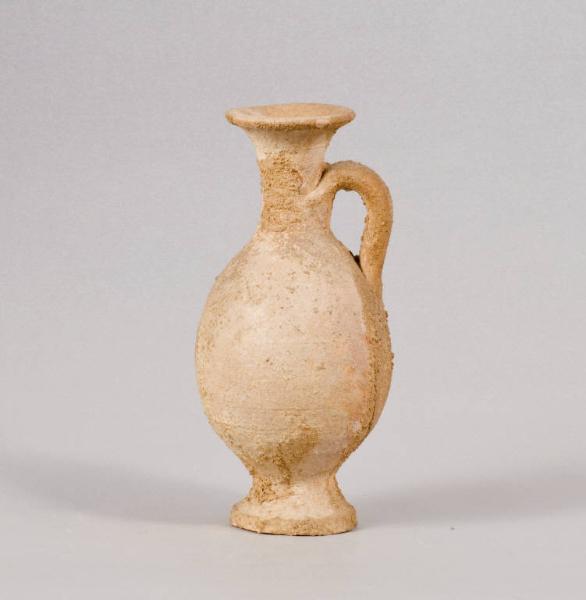 Argilla nocciola chiaro.\nLabbro estroflesso, orlo arrotondato; collo a profilo concavo; corpo globulare; piede campanulato, fondo piatto. Ansa a nastro impostata verticalmente sul collo e sul corpo.