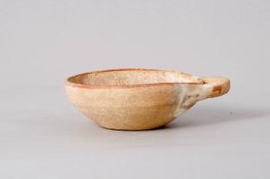 coppa monoansata decorata a fasce.\n\nCorpo ceramico nocciola; decorazione in rosso.\nAmpia vasca a calotta rientrante all'orlo, fondo piatto. Ansa a nastro impostata orizzontalmente sotto l'orlo.