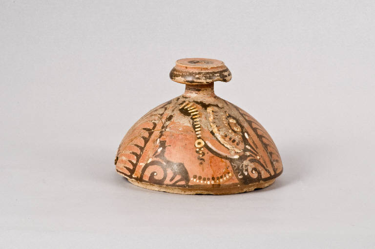 Corpo ceramico beige, ingobbio nocciola, vernice arancio, vernice nera-marrone opaca. Sovraddipinture bianche.\nCorpo a profilo obliquo, pomello formato da uno stelo cilindrico unito ad un elemento circolare schiacciato sormontato da una terminazione troncoconica internamente ribassata.