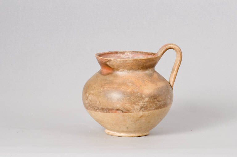 Corpo ceramico beige, vernice nera-rossiccia.\nCollo svasato, corpo globoso, piede ad anello; ansa a nastro impostata sull'orlo e sul corpo. Piede a risparmio, come l'interno.