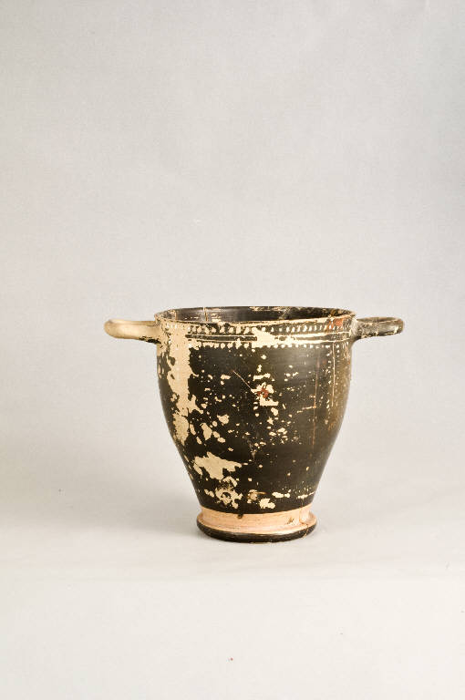 Corpo ceramico beige; vernice marrone nera opaca; ingobbio rossiccio; sovraddipinture bianco-crema e amaranto.\nOrlo estroflesso ed arrotondato, vasca ovoidale; piede ad anello con profilo arrotondato, fondo cavo; ansa a bastoncello impostate orizzontalmente al di sotto dell'orlo.