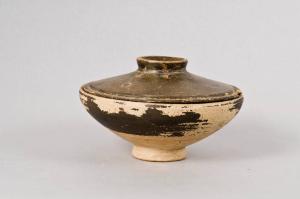 Corpo ceramico beige; vernice bruna rossastra a macchie diluita. \nOrlo indistinto a profilo arrotondato, leggermente introflesso, corpo emisferico, piede ad anello ombelicato.