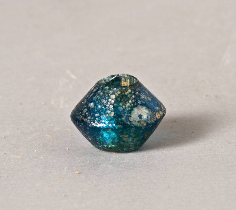 Vago in vetro turchese, di forma circolare con carenatura centrale.