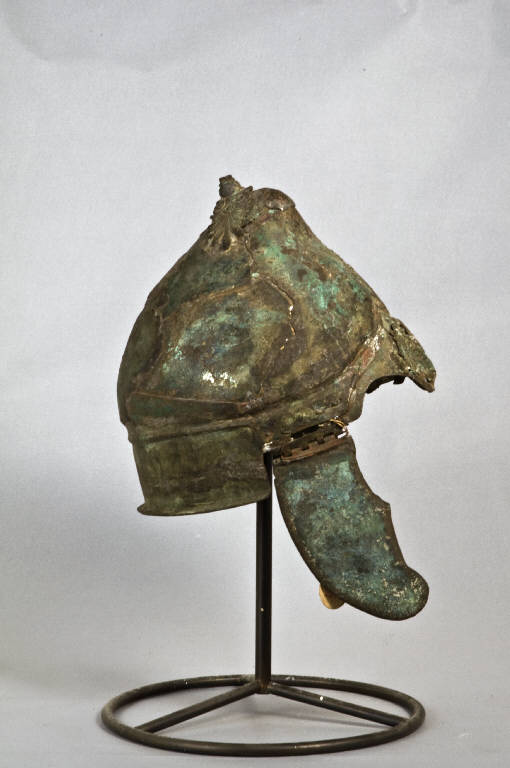 Calotta a forma di berretto frigio; sulla fronte applique in lamina sbalzata decorata con un gorgoneion. Alla sommità della calotta è conservato l'attacco del sostegno per il pennacchio costituito da due palmette a quindici lobi sormontate da bottone a verga. Tramite cerniere in lamina con orlo ritagliato a onde correnti, sono fissate alla calotta, con ribattini, le paragnatidi anatomiche.