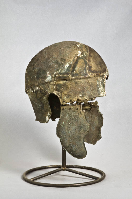Calotta ogivale, tesa distinta risalente a punta sulla fronte con bordo decorato da brevi incisioni; la fronte è segnata da un motivo a v rovesciata; apertura per le orecchie a forma di u rovesciata. Paranuca con orlo arrotondato, leggermente rialzato. Paragnatidi anatomiche mobili, collegate all'elmo mediante cerniere, fissate con tre ribattini, hanno orlo arrotondato.\nAlla sommità attacchi, mal conservati, per i pennacchi.