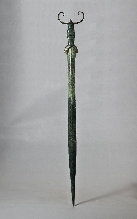 Lama con costolatura arrotondata che si allarga nellla parte centrale della spada; l'impugnatura è fusa in un sol pezzo con la spada, fusiforme con triplice listello. Elsa ad antenne ricurve.