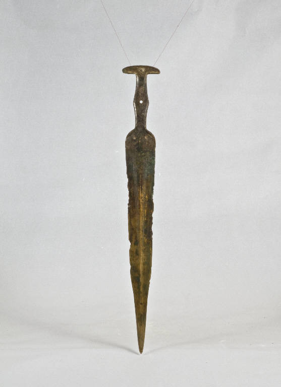 La lama, a bordi paralleli, si restringe verso la punta sino a convergere; nella parte mediana decorazione costituita da tre striature con andamento rettilineo convergente. Nell'impugnatura tallone e pomolo hanno margini rialzati per l'inserzione del pomolo in materiale organico: presenti fori per fissaggio.
