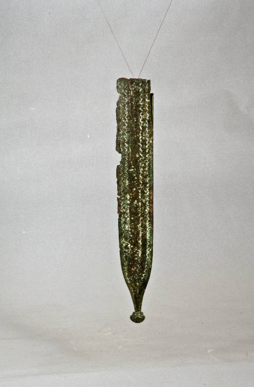 Fodero formato da una sola lamina ripiegata su se stessa ai bordi, incastrata in un puntale costituito da un pomello di bronzo fuso.\nUna faccia del fodero, lungo i bordi, è decorata con fasce longitudinali di doppie linee a zig-zag.