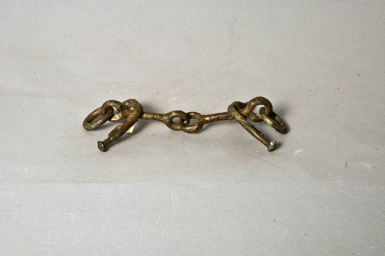 Filetto snodato con estremità a capocchia; montanti di forma arcuata terminanti in doppie protomi di cavallo dalle quali sporge una palmetta. Campanello a forma vegetale chiusa da palmetta.