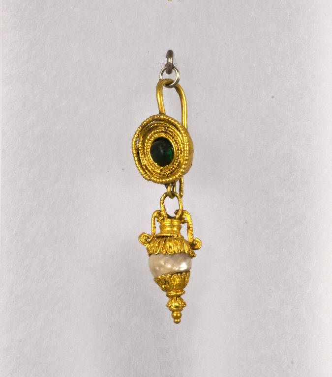 Disco in lamina con filo godronato e fili di vari intreccci intorno al bordo e smeraldo rotondo cabochon incastonato nella parte centrale. Dal disco pende un'anfora con parte centrale del corpo costituita da una perla con parti in filigrana. Gancio filiforme con estremità ripiegata.