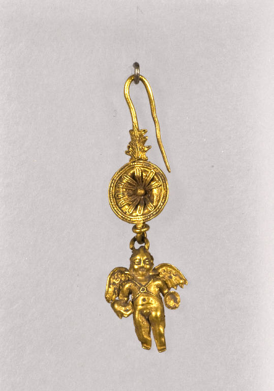 Orecchino a disco con pendente; disco in lamina sormontato da una palmetta e ornato da una rosetta a filigrana con dodici petali. Da un anello saldato presso il bordo pende un erote realizzato a sbalzo, dotato di ali e con bretelle incrociate sul petto. L'erote tiene in una mano una maschera, nell'altra una patera.