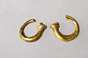 Ad un lungo gancio diritto e inclinato all'indietro è saldato un leone a tutto tondo, seduto con gambe posteriori piegate e quelle anteriori diritte e criniera indicata. Poggia su di una basetta rettangolare. Sopra la testa del leone è collegato un disco con castone di granato rotondo, circondato da sferette auree; seguono altri due castoni. In origine provvisto di pendente collegato a un foro posto sul fondo della base.