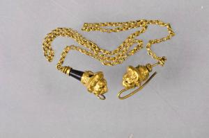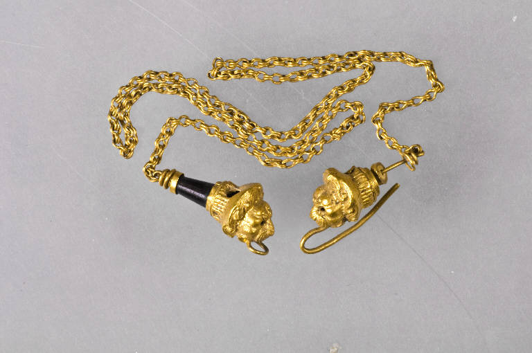 Catena a maglia doppia con terminali a protome leonina.\nLa maglia è costituita da una serie di elementi circolari schiacciati al centro e ripiegati su se stessi, agganciati l'uno all'altro, chiusi da terminali a protome leonina con elemento di raccordo troncoconico. Gancio costituito da un anello e un filo ripiegato ad uncino saldati alle due fauci dell'animale.