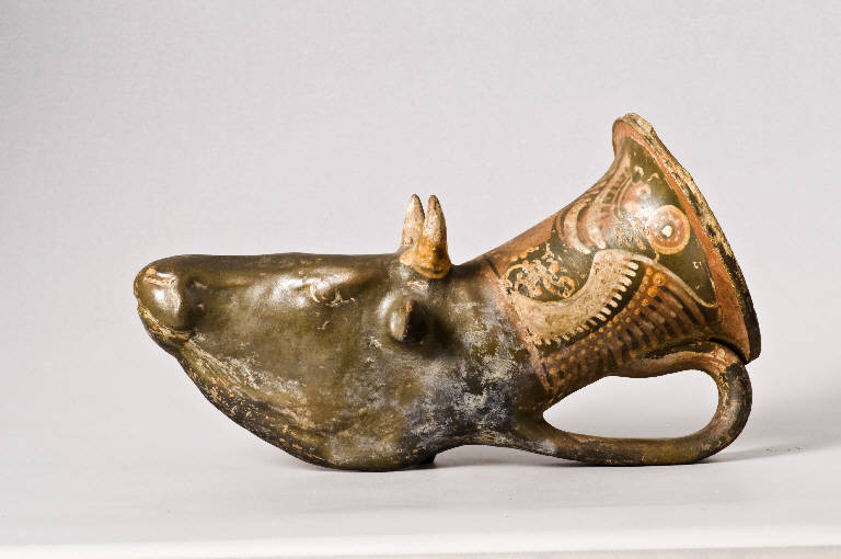 Corpo ceramico arancio-rosato, vernice nera olivastra, ingobbiatura arancio. Sovraddipinture in bianco-giallo.\nBicchiere cilindrico con labbro estroflesso piatto, configurato a testa di bovide. L'animale ha lungo muso, corna in bianco e occhi indicati; sulla fronte ciuffo di peli. Ansa a nastro impostata sul bicchiere e sull'attacco della protome.