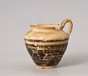 Corpo ceramico beige chiaro, ingobbio crema, vernice nera opaca e bruna.\nLabbro espanso, corpo biconico, base piatta; ansa a bastoncello applicata verticalmente sul labbro e sulla spalla.