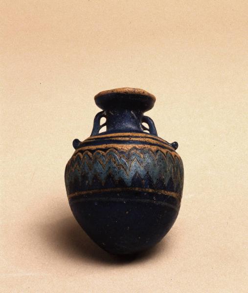 Vetro pressato su nucleo friabile di colore blu.\nOrlo orizzontale, collo cilindrico, corpo globulare. Anse ad anello con nodo.