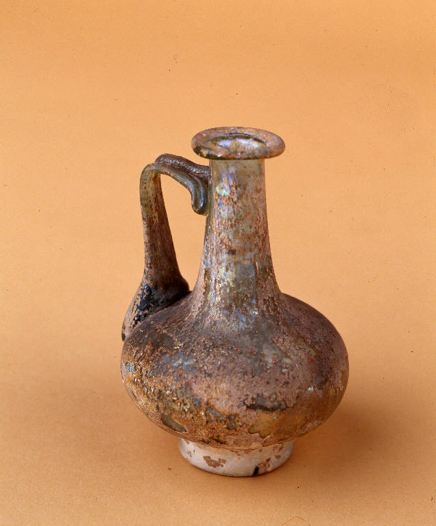 Vetro di colore verde chiaro con bolle d'aria.\nLabbro espanso arrotondato, collo cilindrico, spalla arrotondata, corpo globoso, piede troncoconico. Ansa a nastro piegata ad angolo retto, impostata sotto l'orlo e sul ventre.