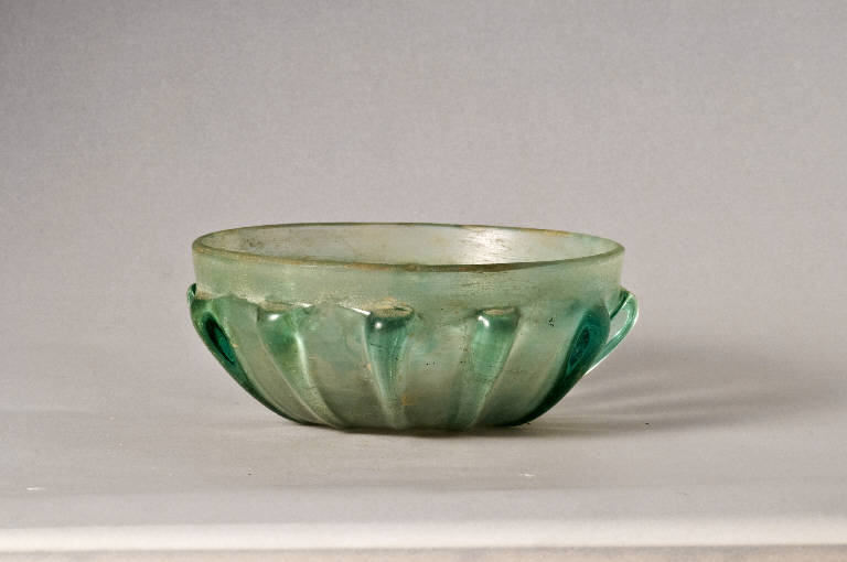 Vetro di colore verde chiaro con bolle d'aria.\nOrlo leggermente obliquo, tagliato e levigato, vasca emisferica a base piana decorata da dodici costolature che si sviluppano dalla base e terminano poco sotto l'orlo.