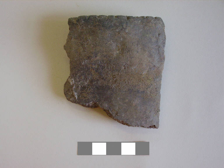 Orlo+ parete di olla\nSi conserva un frammento di orlo indistinto con bordo arrotondato e parte del corpo cilindrico. Sul bordo reca una serie di tacche impresse.\nCorpo ceramico semi grossolano, a superficie esterna e interna lisciata sommariamente.\nColore nucleo: grigio scuro, esterno: grigio, interno: bruno.