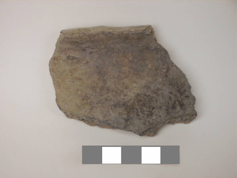 Orlo+ parete di olla\nSi conserva un frammento di orlo svasato con bordo arrotondato e parete.\nCorpo ceramico grossolano, a superficie esterna lisciata sommariamente, interna grezza.\nColore nucleo: grigio, esterno e interno: bruno.