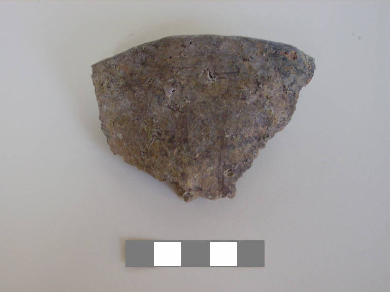 Orlo+ parete di scodella\nSi conserva un frammento di orlo indistinto con bordo appiattito e parete.\nCorpo ceramico grossolano, a superficie esterna con tracce di lisciatura, interna grezza.\nColore nucleo: grigio, esterno e interno: bruno.