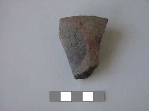 Orlo+ parete di scodella\nSi conserva un frammento di orlo indistinto con bordo appiattito e parete.\nCorpo ceramico grossolano, a superficie esterna e interna grezza.\nColore nucleo, esterno e interno: bruno.