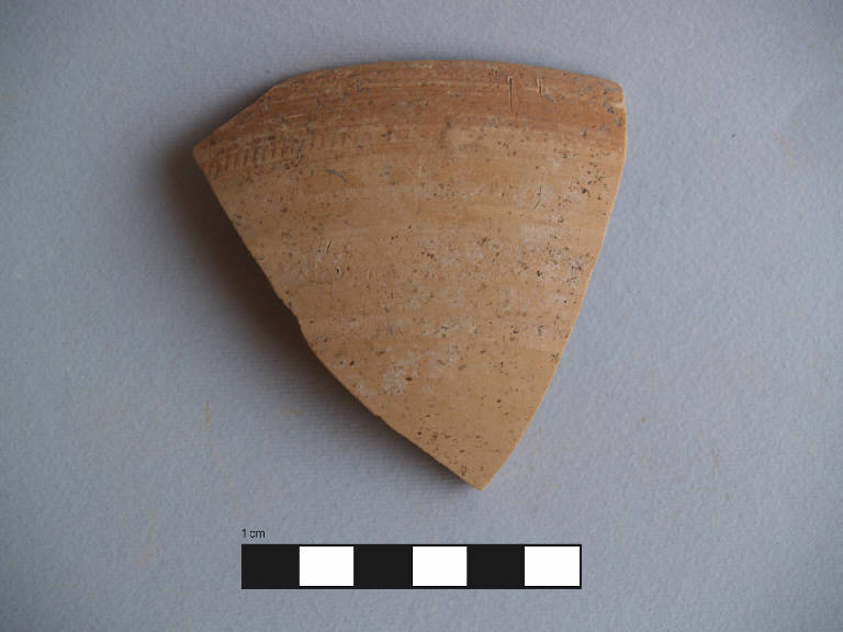 Orlo+parete di ciotola. \nOrlo assottigliato, arrotondato, labbro leggermente rientrante a profilo rettilineo, carena arrotondata, vasca troncoconica mediamente profonda; due scanalature parallele 1,5 cm ca. sotto la carena.\nCorpo ceramico molto compatto, con superficie liscia e compatta, con depurazione buona, assenza di inclusi. Colore nucleo: beige chiaro; sup. esterna: beige chiaro, una banda dipinta di colore rosso-arancio nella parte superiore, delimitata inferiormente da una fascia di lineette verticali parellele, conservatasi solo in parte; sup. interna: dipinta di rosso-arancio.