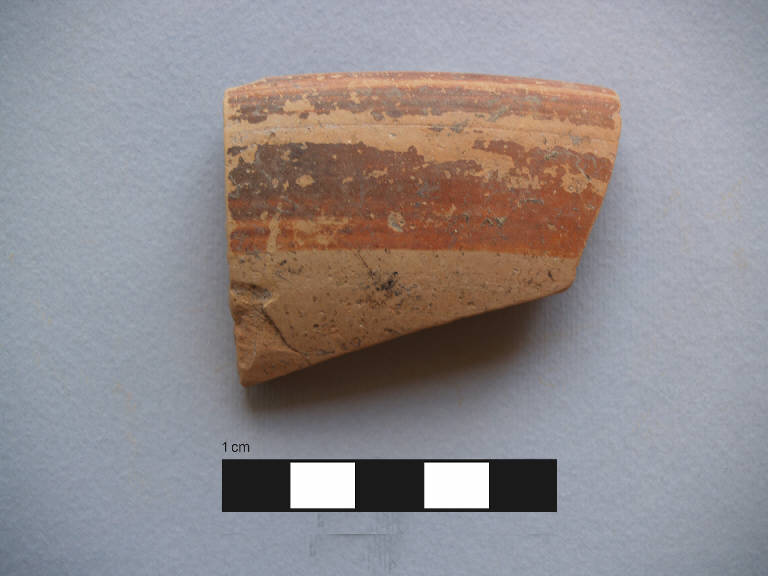 Orlo+parete di ciotola.\nOrlo assottigliato, arrotondato, labbro verticale a profilo curvilineo, vasca a calotta mediamente profonda. \nCorpo ceramico poco compatto, con superficie farinosa, con depurazione buona, assenza di inclusi. Colore nucleo: giallo-rosato; sup. esterna: giallo-rosato, una banda dipinta di colore rosso-bruno nella parte superiore; sup. interna: dipinta di rosso-bruno.