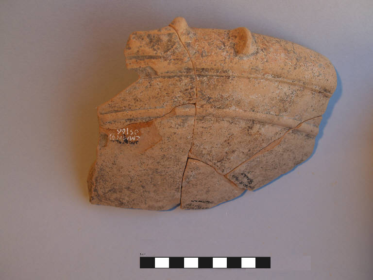Orlo+parete decorata di mortaio. \nOrlo ingrossato a fascia arrotondata, labbro leggermente rientrante, vasca troncoconica profonda; sull'orlo è impostato un beccuccio versatoio lacunoso e una presa a bugna impostata verticalmente; un cordone orizzontale 2 cm ca. al di sotto dell'orlo; grani minerali sulla superficie interna.\nCorpo ceramico poco compatto, con superficie farinosa, con depurazione buona, assenza di inclusi. Colore nucleo: arancio-rosato; sup. esterna: arancio-rosato, tracce di una banda dipinta di colore rosso sul labbro; sup. interna: arancio-rosato, tracce di una banda dipinta di colore rosso sul labbro.\n5 frammenti combacianti.