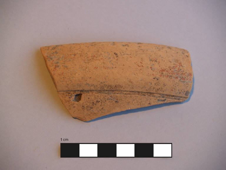 Orlo+parete di mortaio. \nOrlo ingrossato a fascia arrotondata, con una leggera rastrematura all'esterno, labbro verticale, attacco di vasca; una sottile solcatura tra il l'orlo e l'attacco della vasca.\nCorpo ceramico poco compatto, con superficie farinosa, con depurazione buona, assenza di inclusi. Colore nucleo: giallo-rosato; sup. esterna: giallo-rosato, una banda dipinta di colore rosso sull'orlo; sup. interna: giallo-rosato.