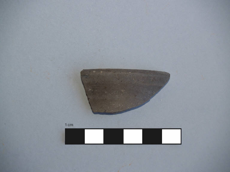 Orlo+parete di forma chiusa (olla?).\nOrlo piatto, obliquo verso l'esterno, labbro estroflesso.\nCorpo ceramico molto compatto, con superficie esterna particolarmente liscia e compatta, con depurazione buona, con numerosi inclusi micacei di piccole dimensioni affioranti anche in superficie. Colore nucleo: grigio scuro; sup. esterna: grigio scuro; sup. interna: grigio scuro.\nProbabilmente pertinente al frammento 179/27 - St 160786.