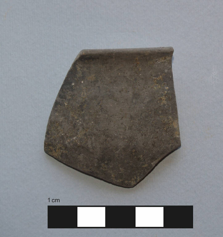 Orlo+parete di skyphos. \nOrlo assottigliato, arrotondato, breve labbro estroflesso a profilo curvilineo, vasca troncoconica rastremata verso il fondo.\nCorpo ceramico compatto, con superficie liscia e compatta, con depurazione buona, assenza di inclusi. Colore nucleo: grigio; sup. esterna: grigio; sup. interna: grigio.