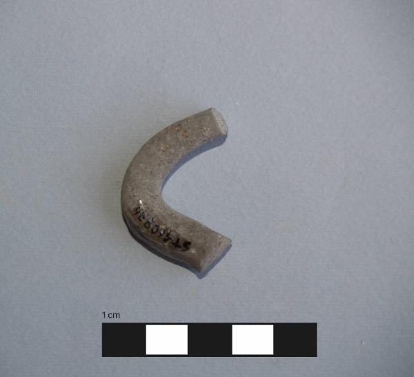 Ansa di skyphos.\nAnsa a bastoncello, orizzontale.\nCorpo ceramico compatto, con superficie farinosa, con depurazione buona, assenza di inclusi. Colore nucleo: grigio; sup. esterna: grigio; sup. interna: grigio.
