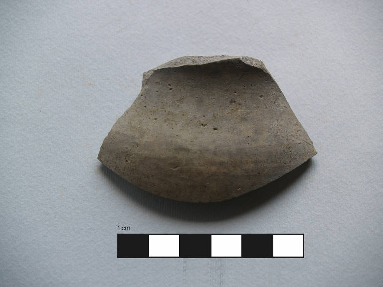 Parete di forma chiusa (olla).\nSpalla arrotondata, probabile labbro estroflesso.\nCorpo ceramico compatto, con superficie particolarmente liscia e compatta, con depurazione buona, assenza di inclusi. Colore nucleo: grigio; sup. esterna: grigio; sup. interna: grigio.