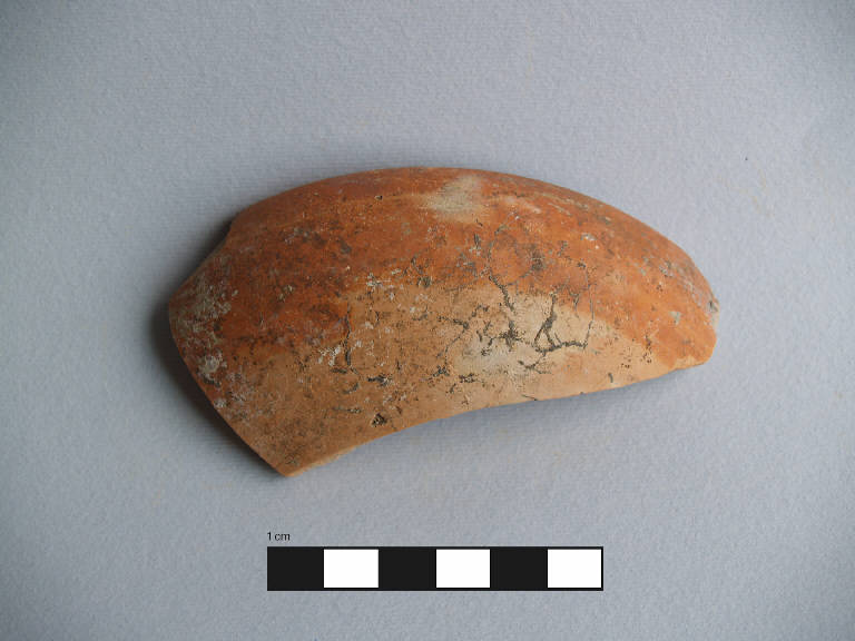 Orlo+parete di ciotola. \nOrlo leggermente assottigliato, arrotondato, labbro verticale a profilo curvilineo, vasca a calotta poco profonda.\nCorpo ceramico compatto, con superficie farinosa, con depurazione buona, assenza di inclusi. Colore nucleo: rosato-arancio; sup. esterna: rosato-arancio, una banda dipinta di colore rosso nella parte superiore; sup. interna: dipinta di rosso.