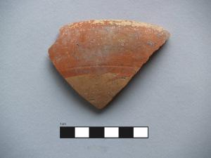 Orlo+parete di ciotola. \nOrlo assottigliato, arrotondato, labbro verticale a profilo curvilineo, vasca a calotta mediamente profonda.\nCorpo ceramico poco compatto, con superficie farinosa, con depurazione buona, assenza di inclusi. Colore nucleo: giallo-rosato; sup. esterna: giallo-rosato, una banda dipinta di colore rosso nella parte superiore; sup. interna: dipinta di rosso.