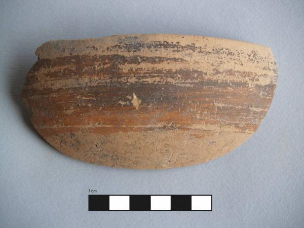 Orlo+parete di ciotola. \nOrlo piatto leggermente arrotondato, labbro verticale a profilo curvilineo, vasca a calotta mediamente profonda.\nCorpo ceramico compatto, con superficie farinosa, con depurazione buona, assenza di inclusi. Colore nucleo: giallo-rosato; sup. esterna: giallo-rosato, una banda dipinta di colore bruno nella parte superiore; sup. interna: dipinta di bruno.