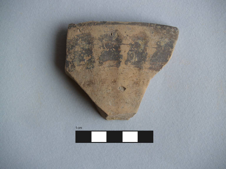 Parete decorata di probabile ciotola o bacino.\nCarena arrotondata, vasca troncoconica.\nCorpo ceramico compatto, con superficie farinosa, con depurazione buona, assenza di inclusi. Colore nucleo: irregolare da beige chiaro a grigio; sup. esterna: irregolare da beige chiaro a grigio, tracce di una banda dipinta di colore bruno al di sopra della carena; 4 probabili impronte digitali parallele con leggera impressione della superficie e colorazione bruna; sup. interna: dipinta di bruno.