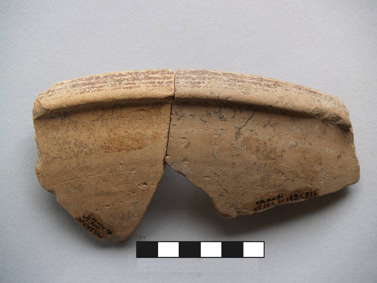 Orlo+parete di mortaio.\nOrlo ingrossato a sezione sub-triangolare, vasca a calotta poco profonda; grani minerali sulla superficie interna.\nCorpo ceramico compatto, con superficie farinosa, con depurazione buona, assenza di inclusi. Colore nucleo: arancio; sup. esterna: arancio, una banda dipinta di colore bruno sull'orlo; sup. interna: arancio, una banda dipinta di colore rosso-bruno nella parte superiore.\n2 frammenti combacianti.