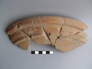 Orlo+parete di mortaio. \nOrlo ingrossato a mandorla, vasca troncoconica mediamente profonda; un cordone orizzontale; grani minerali sulla superficie interna.\nCorpo ceramico compatto, con superficie farinosa, con depurazione buona, assenza di inclusi. Colore nucleo: irregolare da arancio a rosato scuro; sup. esterna: arancio, una banda dipinta di colore rosso dall'orlo al cordone compreso; sup. interna: arancio, scarse tracce di pittura di colore rosso in prossimità dell'orlo.\n12 frammenti combacianti.