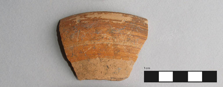 Orlo+parete di ciotola. \nOrlo assottigliato, arrotondato, labbro verticale a profilo curvilineo, vasca a calotta poco profonda.\nCorpo ceramico compatto, con superficie farinosa, con depurazione buona, assenza di inclusi. Colore nucleo: arancio-rosato; sup. esterna: arancio-rosato, una banda dipinta di colore rosso-arancio nella parte superiore; sup. interna: dipinta di rosso.