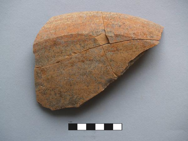 Orlo+parete di ciotola. \nOrlo arrotondato, labbro verticale a profilo rettilineo, carena leggermente arrotondata, vasca troncoconica profonda.\nCorpo ceramico compatto, con superficie farinosa, con depurazione buona, assenza di inclusi. Colore nucleo: giallo-rosato; sup. esterna: giallo-rosato, una banda dipinta di colore rosso nella parte superiore; sup. interna: dipinta di rosso.\n4 frammenti combacianti.