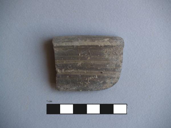 Orlo+parete di ciotola. \nOrlo ingrossato a sezione triangolare, obliquo verso l'esterno, vasca troncoconica mediamente profonda.\nCorpo ceramico compatto, con superficie farinosa, con depurazione buona, assenza di inclusi. Colore nucleo: grigio-beige; sup. esterna: dipinta di grigio-nerastro; sup. interna: dipinta di grigio-nerastro.